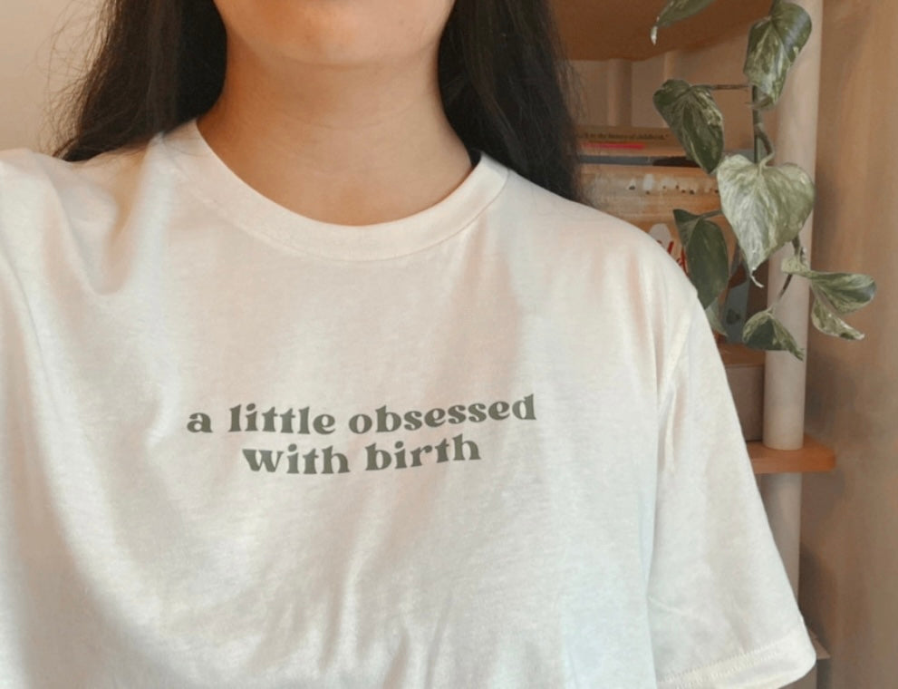 Our “a little obsessed with birth” design in green vinyl on a natural colored tee.